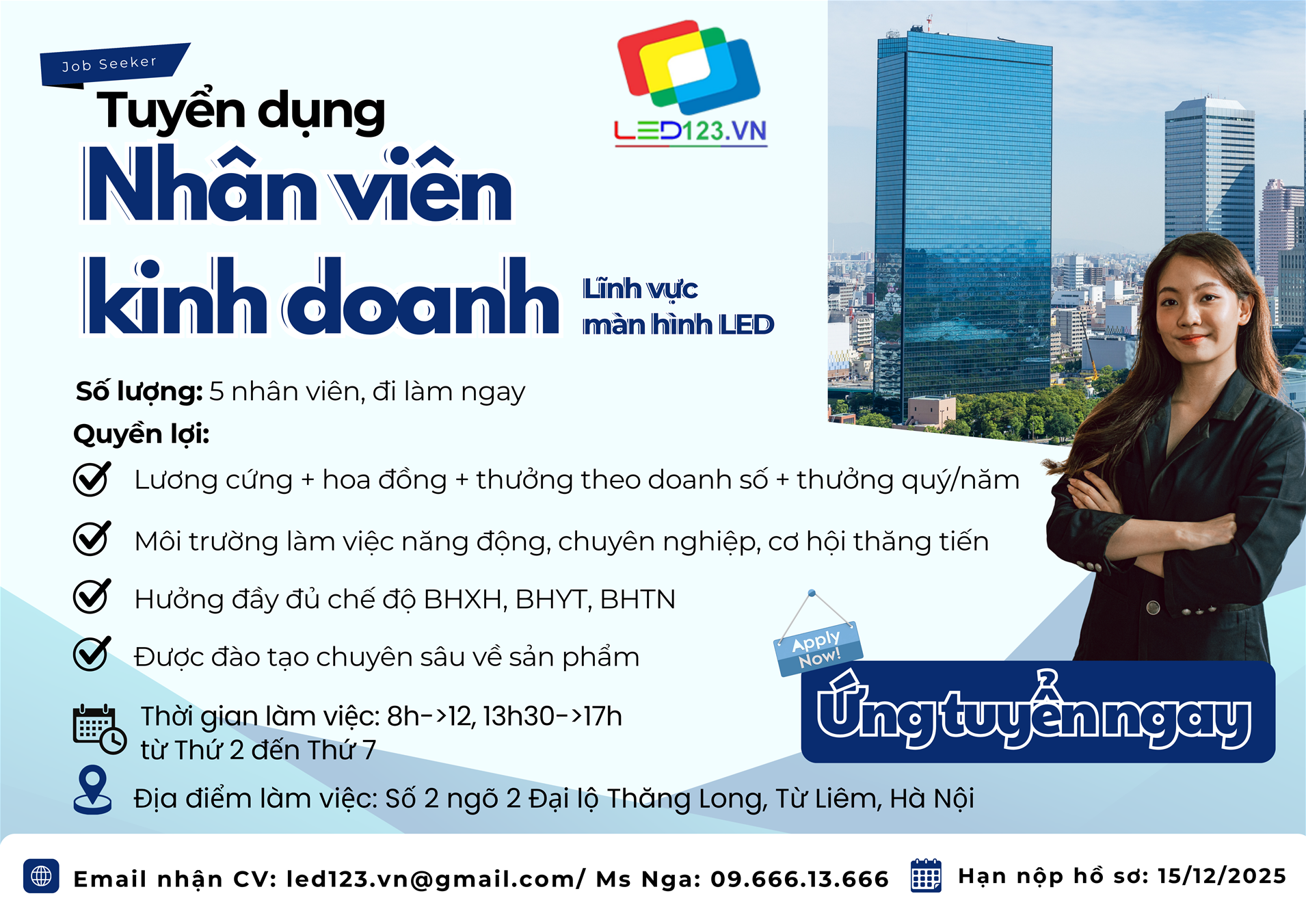 LED123 đơn vị hàng đầu phân phối và thi công màn hình LED đang mở rộng quy mô cùng đội ngũ nhân viên kinh doanh tiềm năng. Liên hệ ngày để ứng tuyển vị trí nhân viên kinh doanh lĩnh vực màn hình LED với mức lương, hoa hồng hấp dẫn !